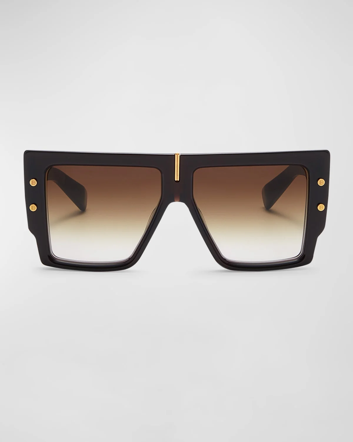 - Balmain "B-Grand" square sunglasses in acetate and titanium - Features monogram accents on the frames and temples - Lens/bridge/temple (in mm): 57-14-145 - Gradient lenses - Saddle nose pads - Wide, tapered arms - 100% UVA/UVB protection - Made in Japan - Proposition 65 warning for California residents