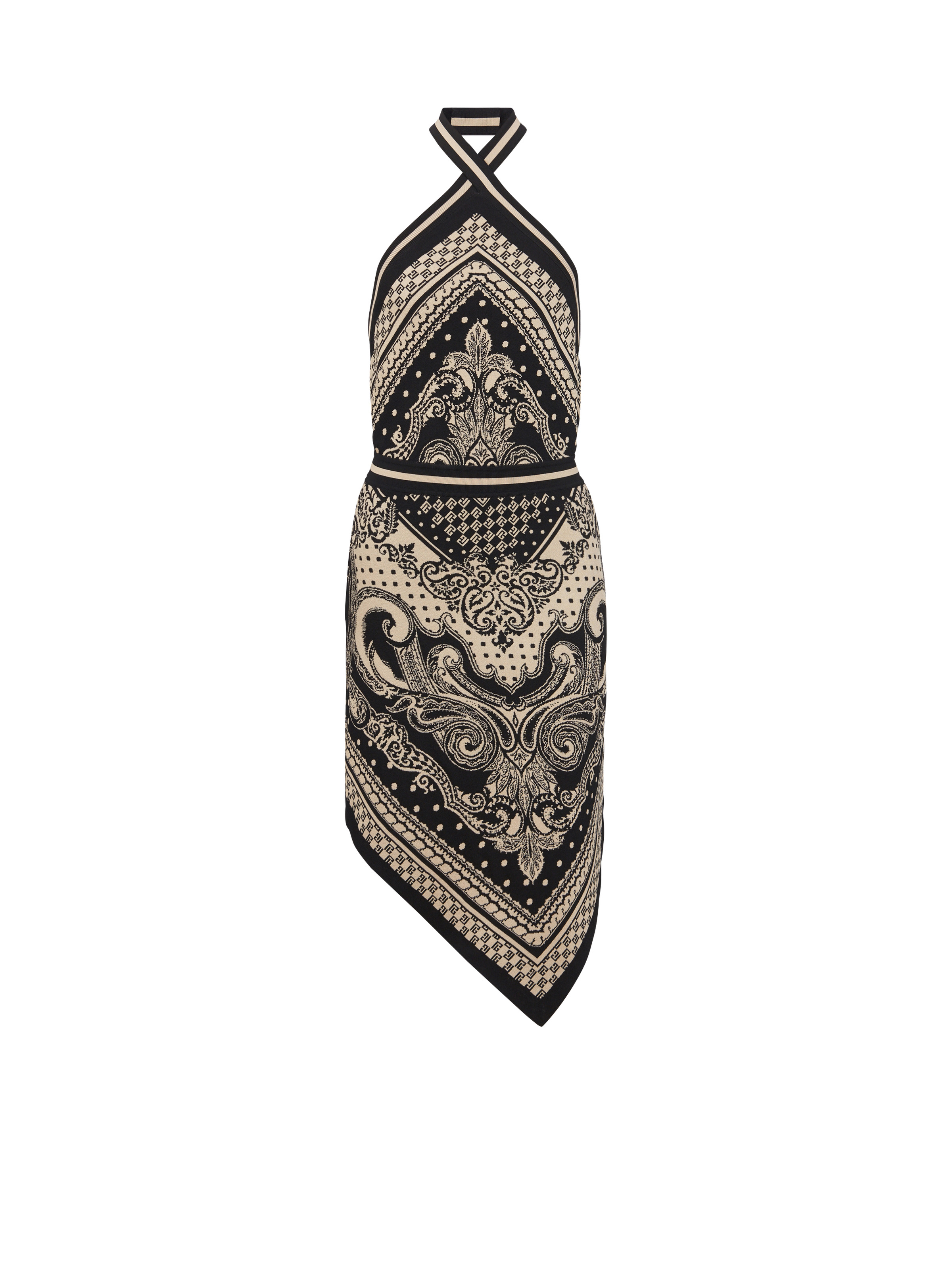Fine knit backless dress - Contrasting mini monogram and paisley jacquard - A-line scarf-style fit with nipped in waist - Fastening with black metal zip and 2 press-studs at the back - Model measures 177cm and wears a size 36 - Main material: 88% viscose 12% polyester - Made in France - Item: CF1RD080KF74100% of this item’s viscose fibres are RCS-certified and recycled
