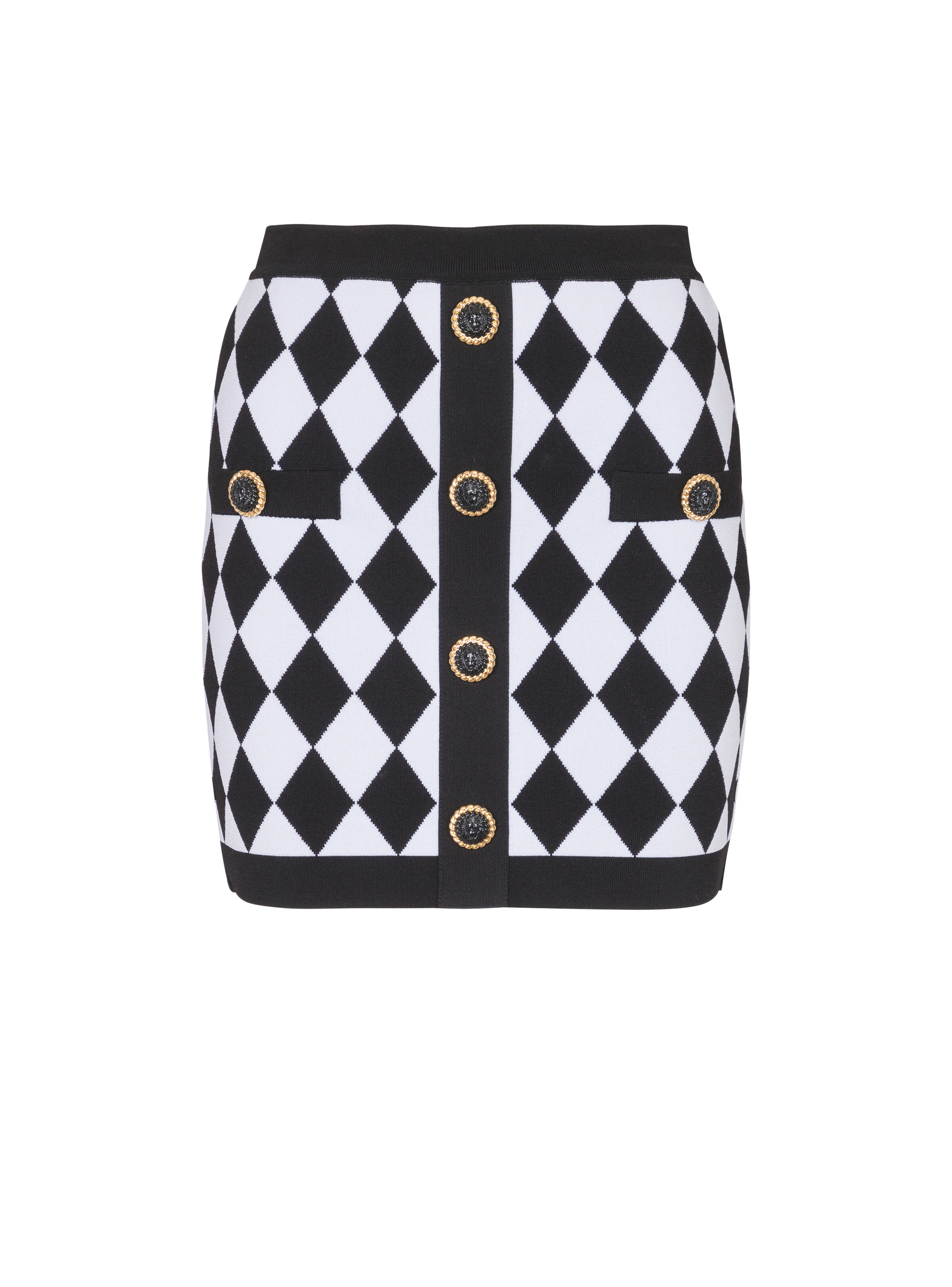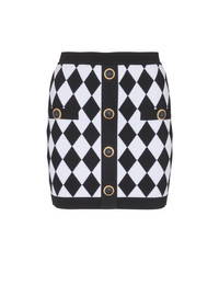 Short diamond jacquard skirt - Fitted and high-waisted - 5 decorative buttons on the front - 2 fake pockets with 2 decorative buttons - Visible gold metal zip fastening on the back with Balmain Paris-engraved slider - Two-tone "Double Chain Lion" buttons in gold and black metal - Contrasting ribbed edging - Model measures 179cm and wears a size 36 - Main material: 88% viscose 10% polyester 2% polyamide - Made in France - Item: DF1LB292KG66 100% of the viscose fibres used to make this garment come from certified, sustainably managed forests