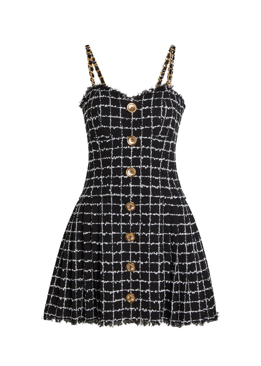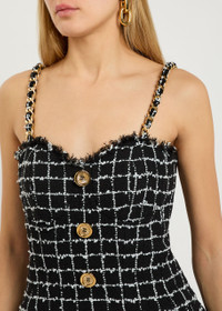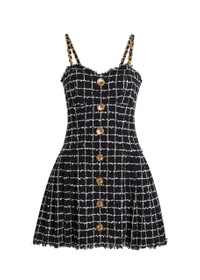 Info & Care Balmain tweed dress Checked, sweetheart neckline, chain-trimmed shoulder straps, padded cups, pleats at skirt, fully lined Concealed hook and zip fastening at back 62% polyamide, 29% cotton, 9% acrylic; lining: 52% viscose, 28% cotton Dry clean Size & Fit Length shoulder to hem: 32 inches/ 81cm Midweight Fitted bodice, A-line skirt Model is 5'9"/ 175cm and wears a size;FR36
