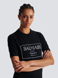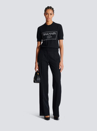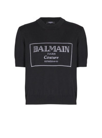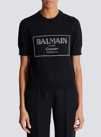 Balmain Couture two-tone knit top - Round neckline - Short sleeves - Contrasting jacquard Balmain Couture logo on the front - Ribbed neckline and hem - Classic fit - Model measures 178cm and wears a size 36 - Main material: 100% virgin wool - Made in Italy - Item: EF1KA115KH87
