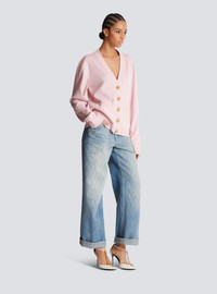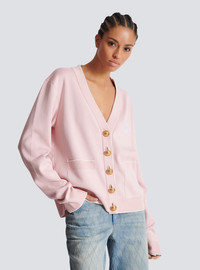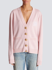 Balmain Embleme-embroidered knit cardigan - V-neckline - Long sleeves - Contrasting Balmain Embleme embroidered on the chest - Front fastening with 5 golden metal "Coin" buttons - 2 patch pockets on the front - Ribbed trim with contrasting piping - Loose fit - Model measures 179cm and wears a size 36 - Main material: 55% silk 45% cotton - Made in Italy - Item: FF1KO003KI86