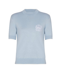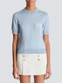 Balmain Embleme-embroidered knit top - Round neckline - Short sleeves - Ribbed trim with contrasting piping - Contrasting Balmain Embleme embroidered on the chest - Fitted cut - Model measures 179cm and wears a size 36 - Main material: 55% silk 45% cotton - Made in Italy - Item: FF1KA115KI86