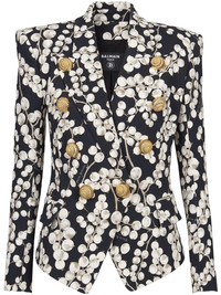 printed blazer Highlights - Black/white - Stretch-design - All-over graphic print - Double-breasted button fastening - Peak lapels - Shoulder pads - Long sleeves - Embossed gold-tone buttons - Two side flap pockets - Straight hem Imported Composition Viscose 96%, Elastane 4%