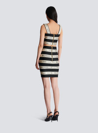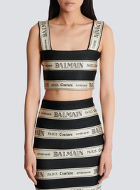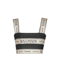 Jacquard top with Balmain ribbon motif - Square neckline - Matching ribbon straps - Visible gold metal zip fastening on the back with Balmain-engraved slider - Jersey lining - Cropped slim fit - Model measures 179cm and wears a size 36 - Main material: 97% viscose 2% polyamide 1% elastane - Made in Portugal - Item: EF1AA370JJ95