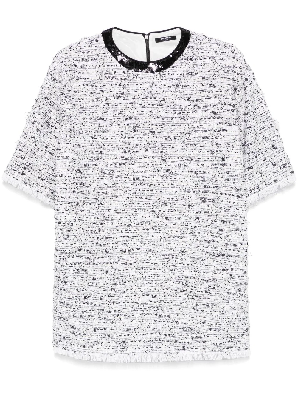 tweed top Highlights - White - Concealed rear zip fastening - Crew neck - Short sleeves - Frayed edge Imported Composition Outer: Cotton 42%, Polyamide 24%, Acrylic 17%, Viscose 10%, Polyester 7% Lining: Viscose 52%, Cotton 48% SIZE & FIT Model measurements Height 5 ft 10 in(1.78 m) Bust/Chest 32.67 in(83 cm) Hips 35.43 in(90 cm) Waist 23.22 in(59 cm) FittingInformation Designed to be unstructured, offering a loose fit throughout Made from a midweight non-stretch fabric