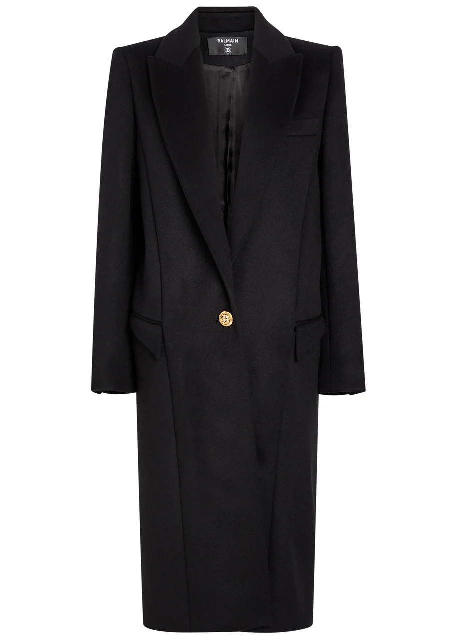 Info & Care Balmain wool and cashmere-blend coat Peaked lapels, padded shoulders, button-fastening cuffs, chest slit pocket, front flap pockets, fully lined Button fastening at front 90% wool, 10% cashmere; lining: 100% cupro Dry clean Size & Fit Length shoulder to hem: 43.5 inches/ 110.5cm Midweight Structured oversized style Model is 5'9"/ 175cm and wears a size;FR36