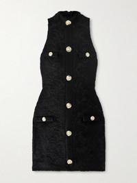 Balmain's mini dress is instantly recognizable thanks to the logo-embossed gold buttons. It's been made in France from boucle that's jacquard-knitted with the label's signature baroque pattern and is designed for a close fit with an elegant high neckline. Wear yours with point-toe pumps.