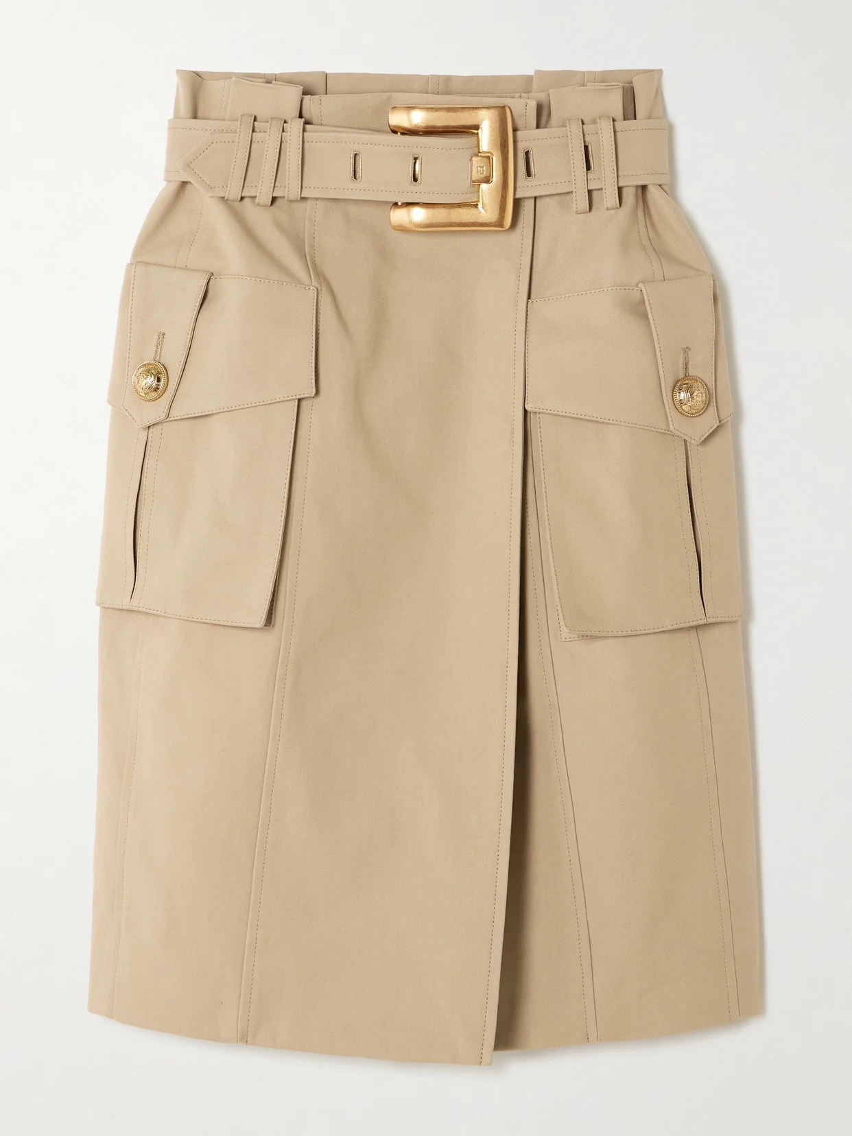 Balmain's knee-length skirt is anchored by an oversized buckle. Tailored from cotton-gabardine, it has a wrap-style front and is handily kitted out with roomy pockets on either side.