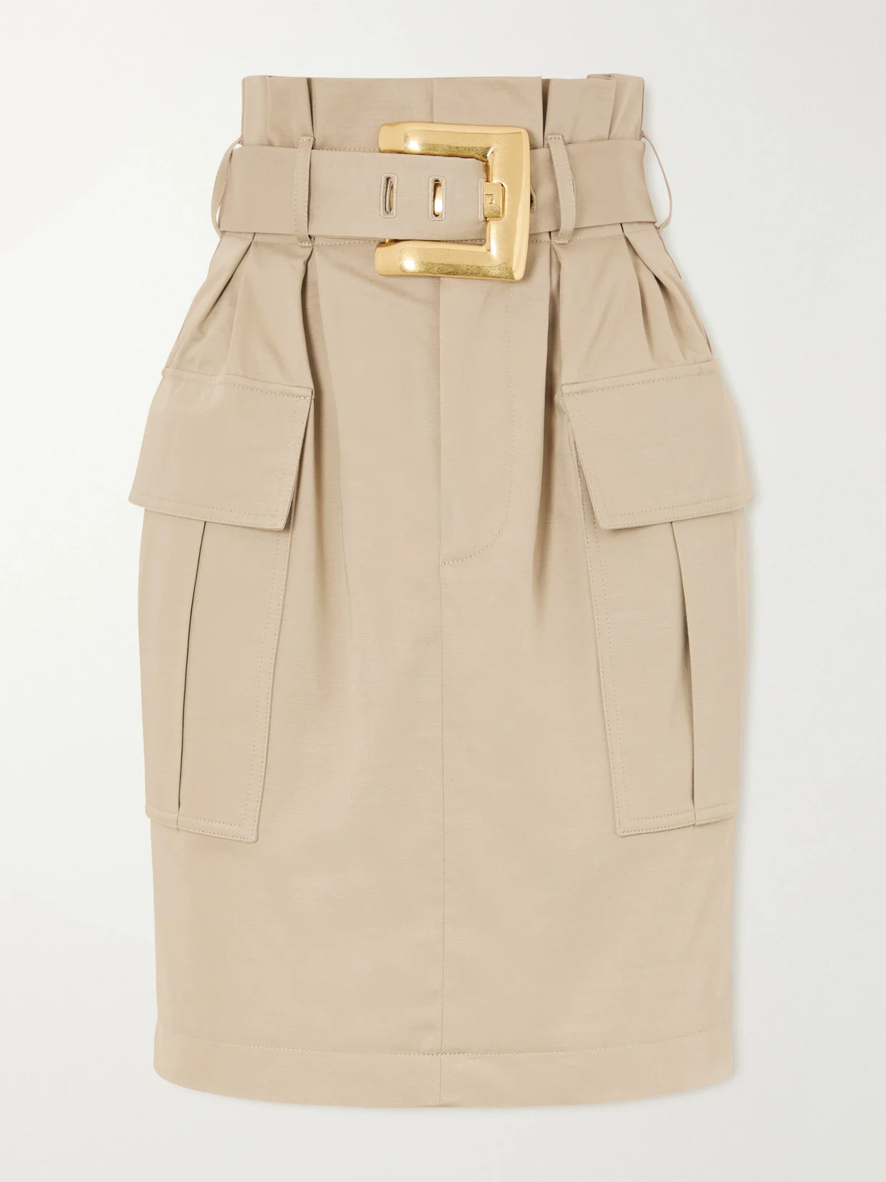 Balmain's skirt channels the house's signature utilitarian edge. Cut from structured cotton-gabardine, it's designed with a wide belted waistband and cargo pockets that enhance the streamlined, sculpted silhouette.