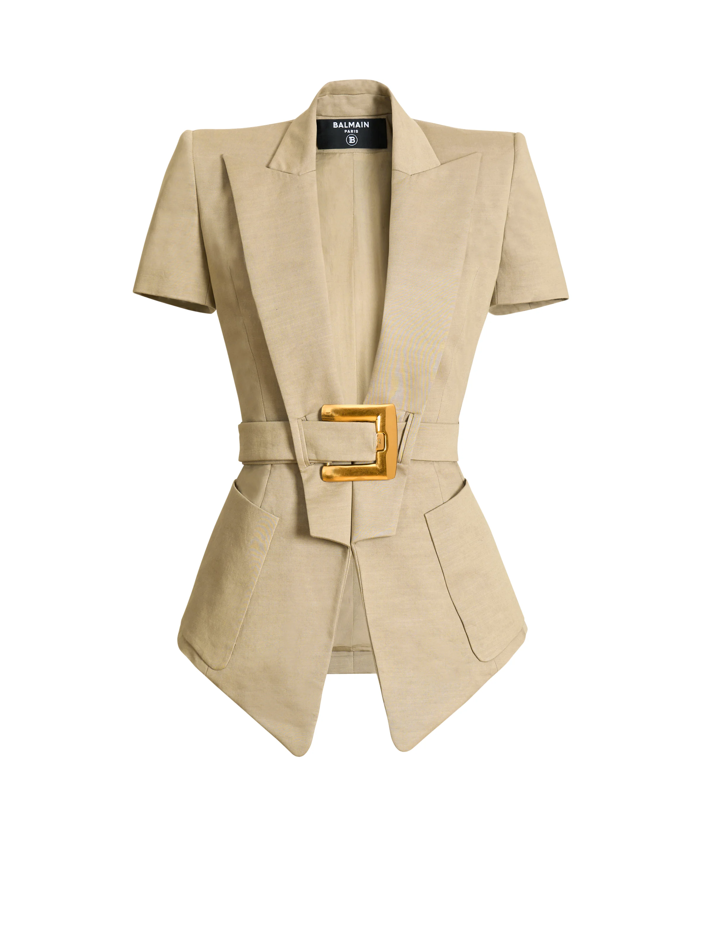 Belted gabardine Anthem jacket - Fitted cut - Plunging tailored collar - Edge-to-edge front fastening - Structured shoulders - Short sleeves - 2 patch side pockets - Matching gabardine belt - Gold metal Anthem buckle with engraved PB logo - Model measures 178cm and wears a size 36 - Main material: 100% cotton - Made in Bulgaria - Item: GF0SB225CG65