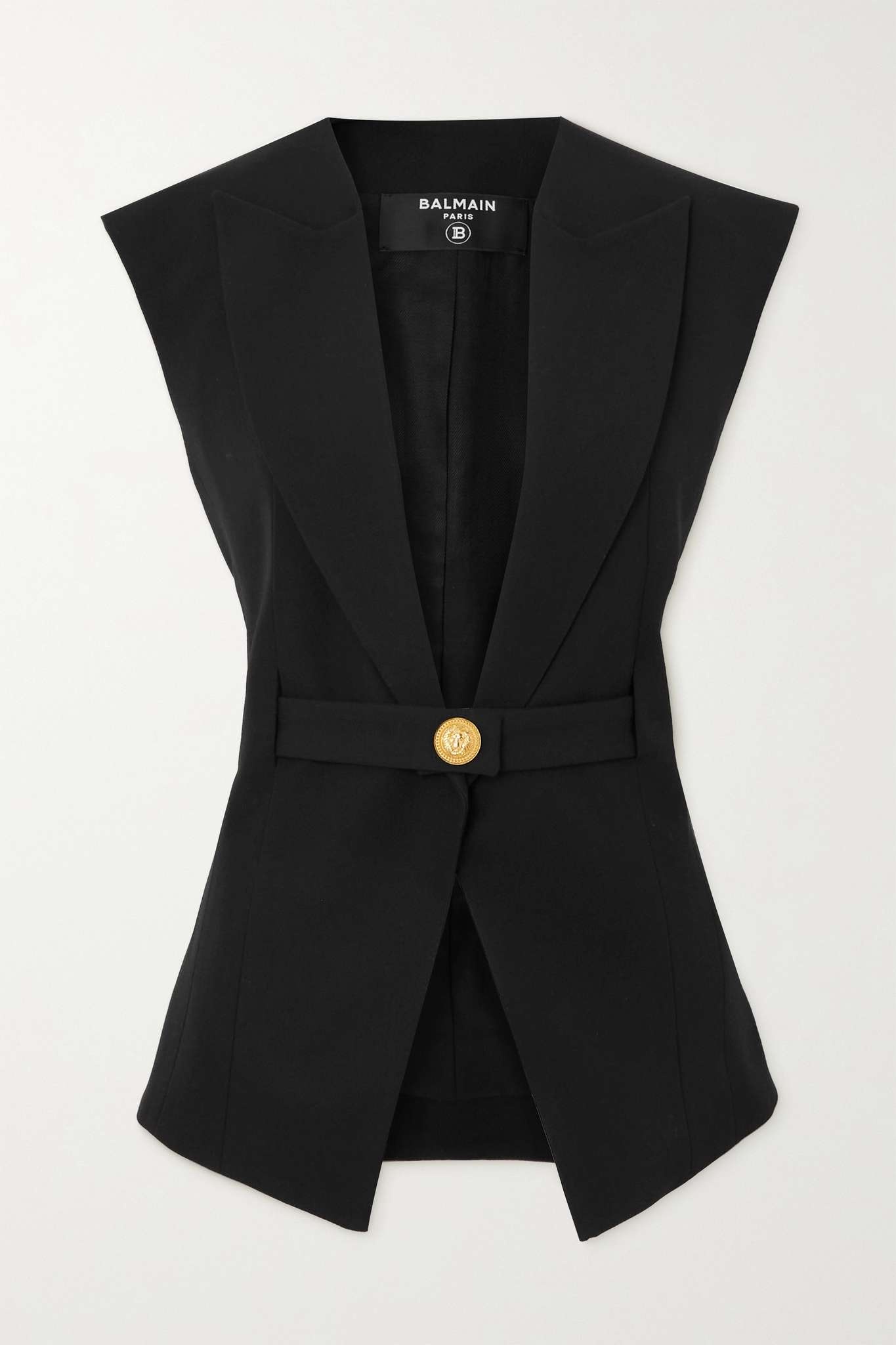 EDITORS'NOTES Balmain's tailoring is built around 'power dressing' - the sharp, structured shoulders that frame this vest are seen throughout its collections. Cut from black wool, its fitted waist is defined by a slim belt, which fastens with one of the house's signature gold-tone buttons. SIZE & FIT - Fits true to size, take your normal size - Designed for a slim fit - Mid-weight, non-stretchy fabric - Model is 177cm/ 5'10" and is wearing a FR 36 DETAILS & CARE - Black wool - Snap fastening at front - 100% wool - Dry clean