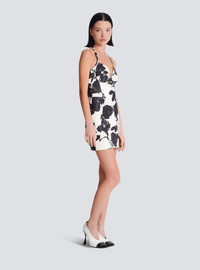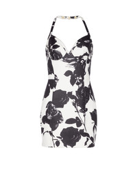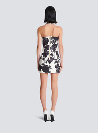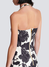 Black and White Roses leather halterneck dress - Short, tight fit - Sweetheart neckline - Structured bustier - Fastening at the neck with 3 "Double Chain Lion" press studs in gold metal - Visible gold metal zip fastening on the back with Balmain Paris-engraved slider - Twill lining - Model measures 175cm and wears a size 36 - Main material: 100% lambskin leather - Made in Turkey - Item: CF0R2320LD13