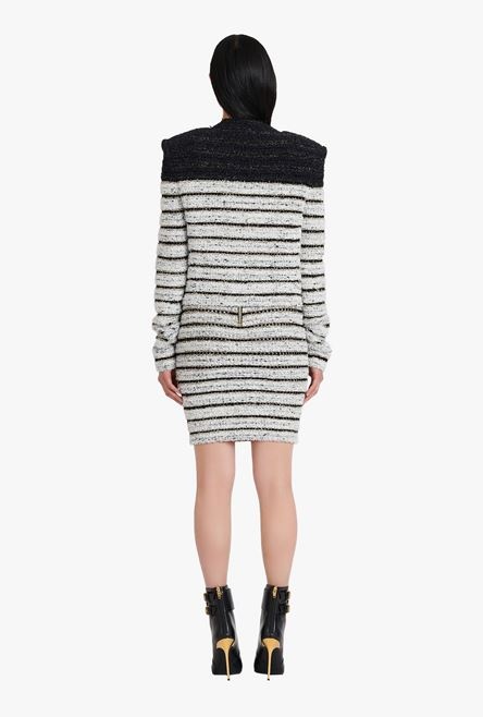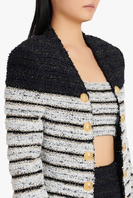 Black and white spencer jacket Long sleeves, structured shoulders, decorative double-breasted buttoned fastening, gold-tone chain decoration ITEM INFORMATION - Fitted cut - Fits true to size, select your usual size - The model is wearing FR size 36 - The model's height is 180 cm / 5 ft 11 in, bust 80 cm / 31 in, waist 59 cm / 23 in, hips 89 cm / 35 in - Made in France - Materials: 44% Viscose, 29% Cotton, 16% Polyamide, 9% Polyester, 2% Metallic Polyester - Item: XF0SC006KB86EDC
