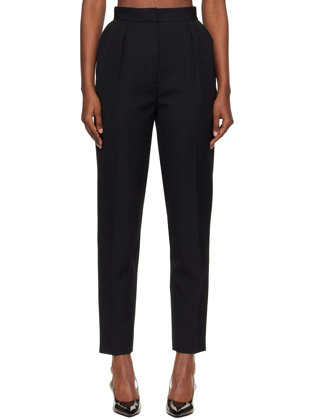 Virgin wool grain de poudre trousers. · High-rise · Two-pocket styling · Zip fly · Pleats at front · Creased legs · Darts at back waist · Full twill lining Supplier color: Black Body: 100% virgin wool. Lining: 52% viscose, 48% cotton. Made in Portugal 252251F087000