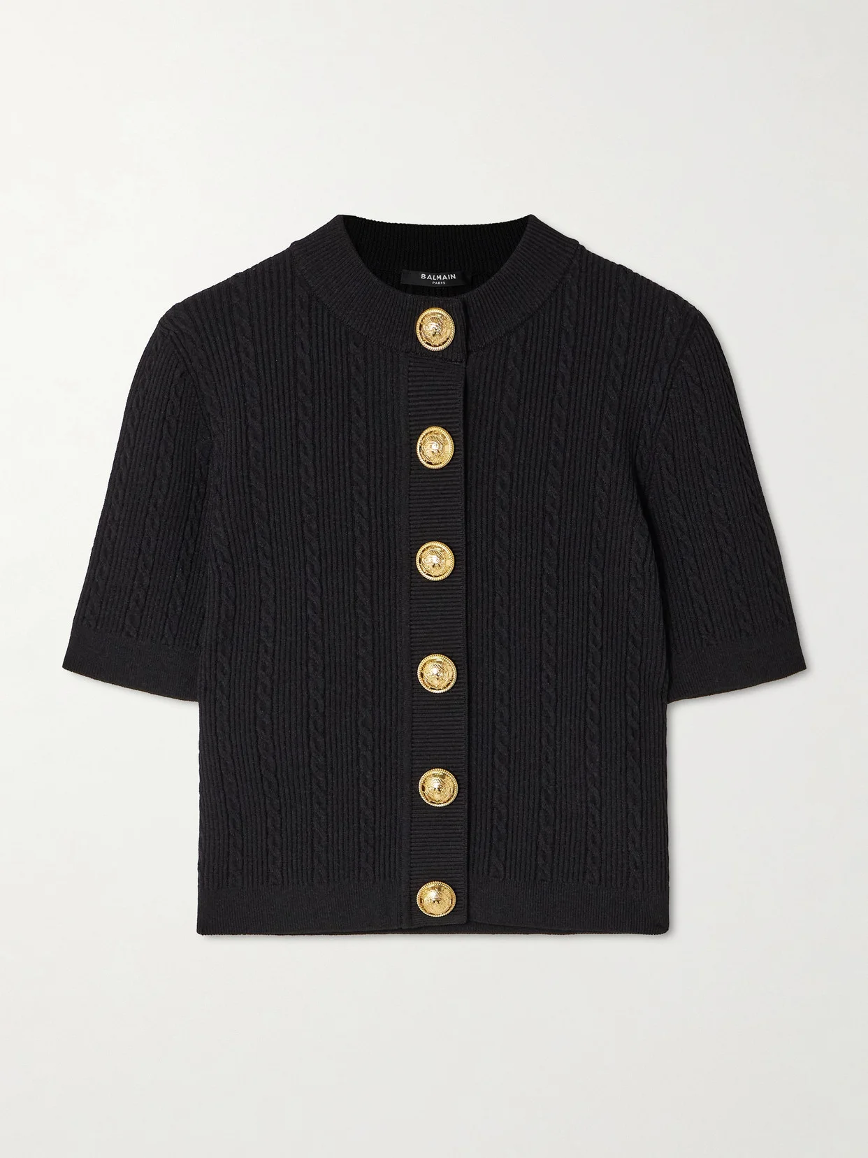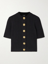 Balmain's short-sleeved cardigan can be worn all year long. It's cable-knitted and has ornate snaps in lieu of traditional buttons. Complement the hardware with gold accessories.