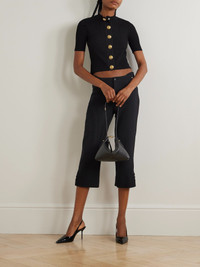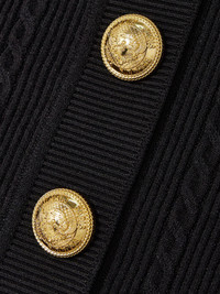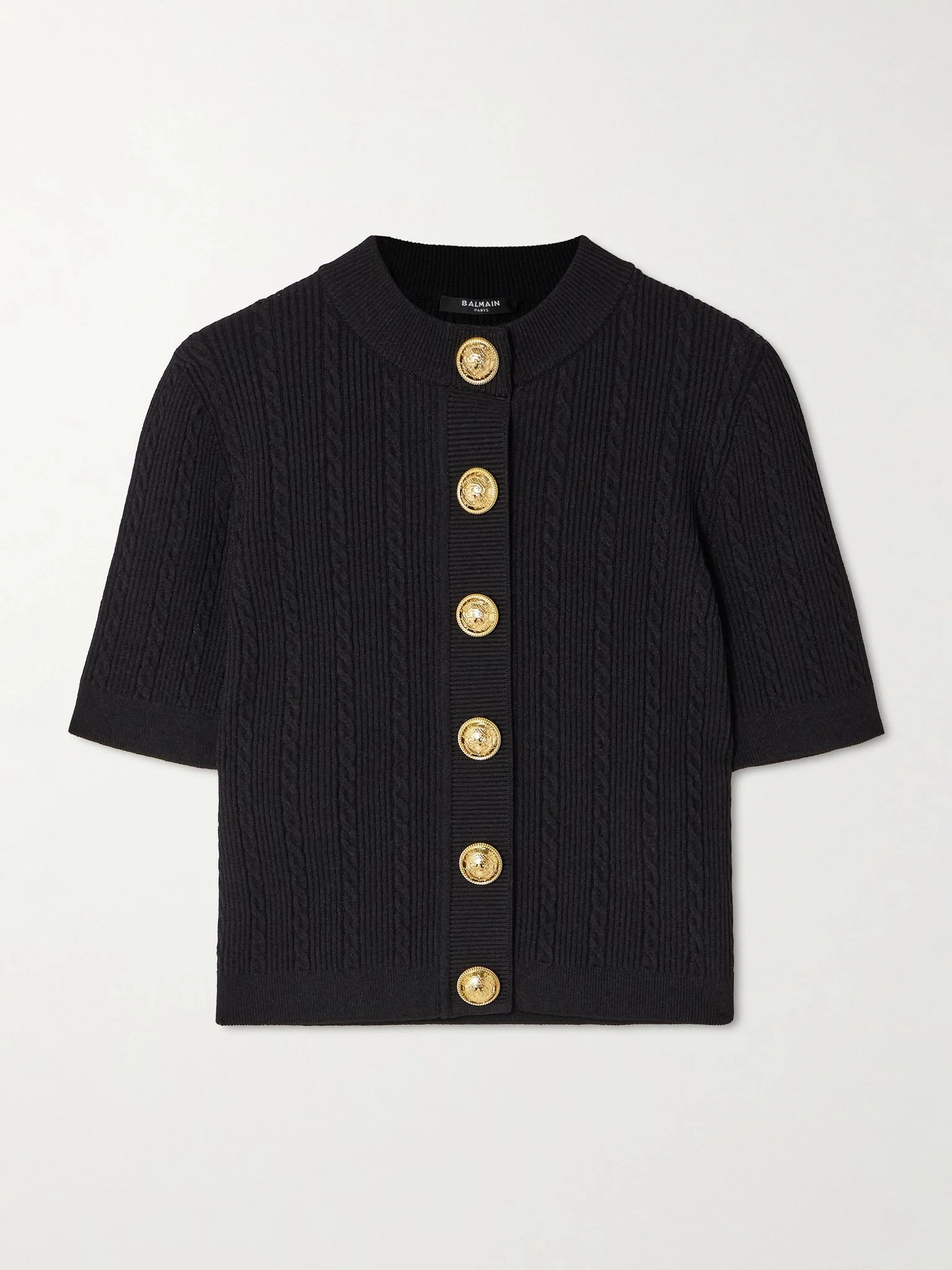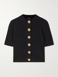 Balmain's short-sleeved cardigan can be worn all year long. It's cable-knitted and has ornate snaps in lieu of traditional buttons. Complement the hardware with gold accessories. Size & Fit - Fits true to size, take your normal size - Intended for a slim fit - Mid-weight, slightly stretchy fabric - Model is 180cm/ 5'11" and is wearing a FR 36 Model measurements: - Bust: 80cm/ 31.5" - Waist: 65cm/ 25.5" - Hip: 89cm/ 35" Details & Care - Black viscose-blend - Snap fastenings through front - 83% viscose, 17% polyester - Dry clean