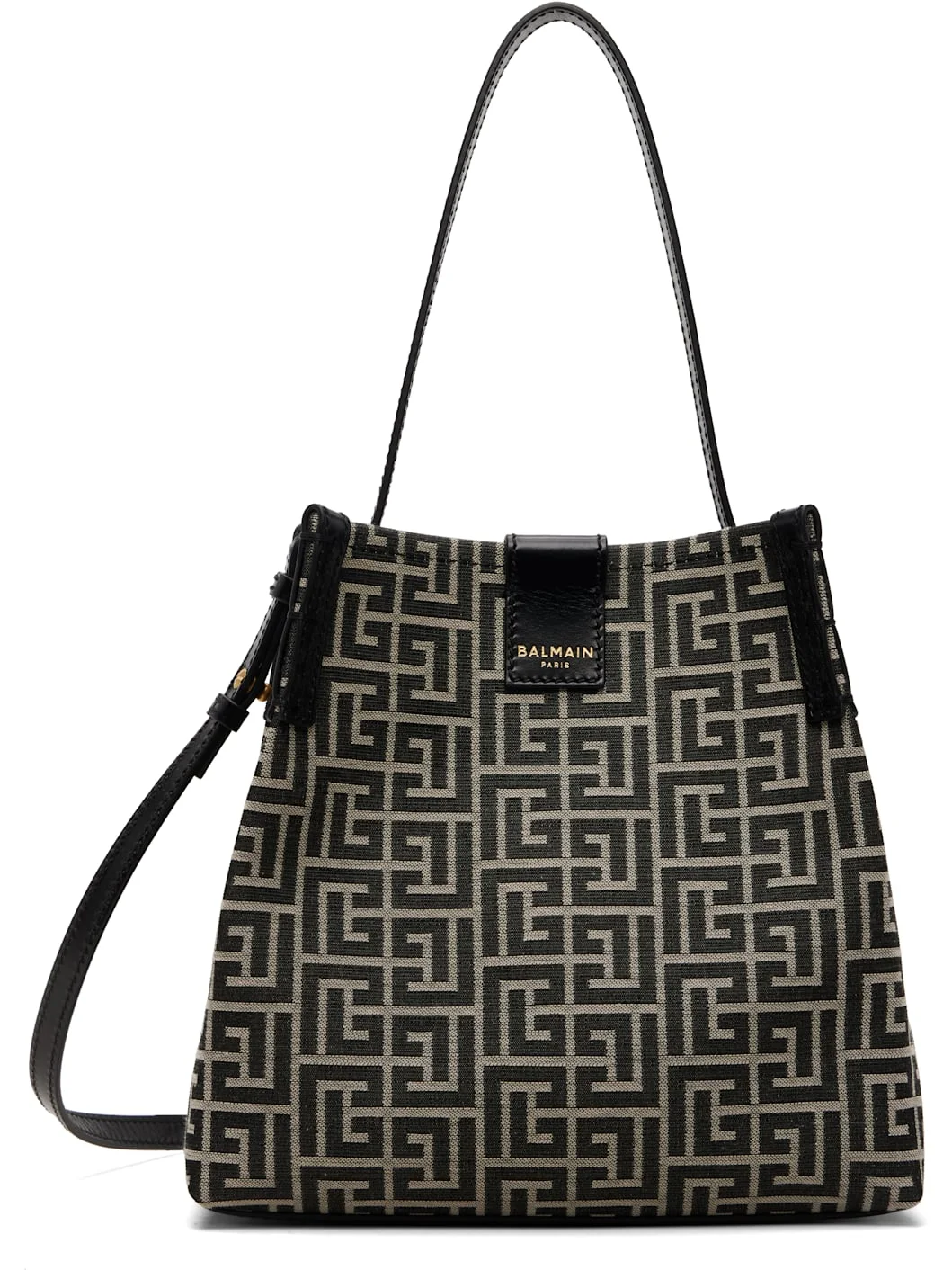 Coated jacquard weave top handle bag. · Logo pattern throughout · Logo printed at face · Polished calfskin carry handle and detachable shoulder strap · Press-stud closure · Patch pocket with card slot at interior · Twill lining · H9.5” x W9.5” x D3.75” Supplier color: Black Body 1: 47% cotton, 19% polyester, 17% polyamide, 17% polyurethane. Body 2: 100% calfskin. Made in Italy 261251F046000
