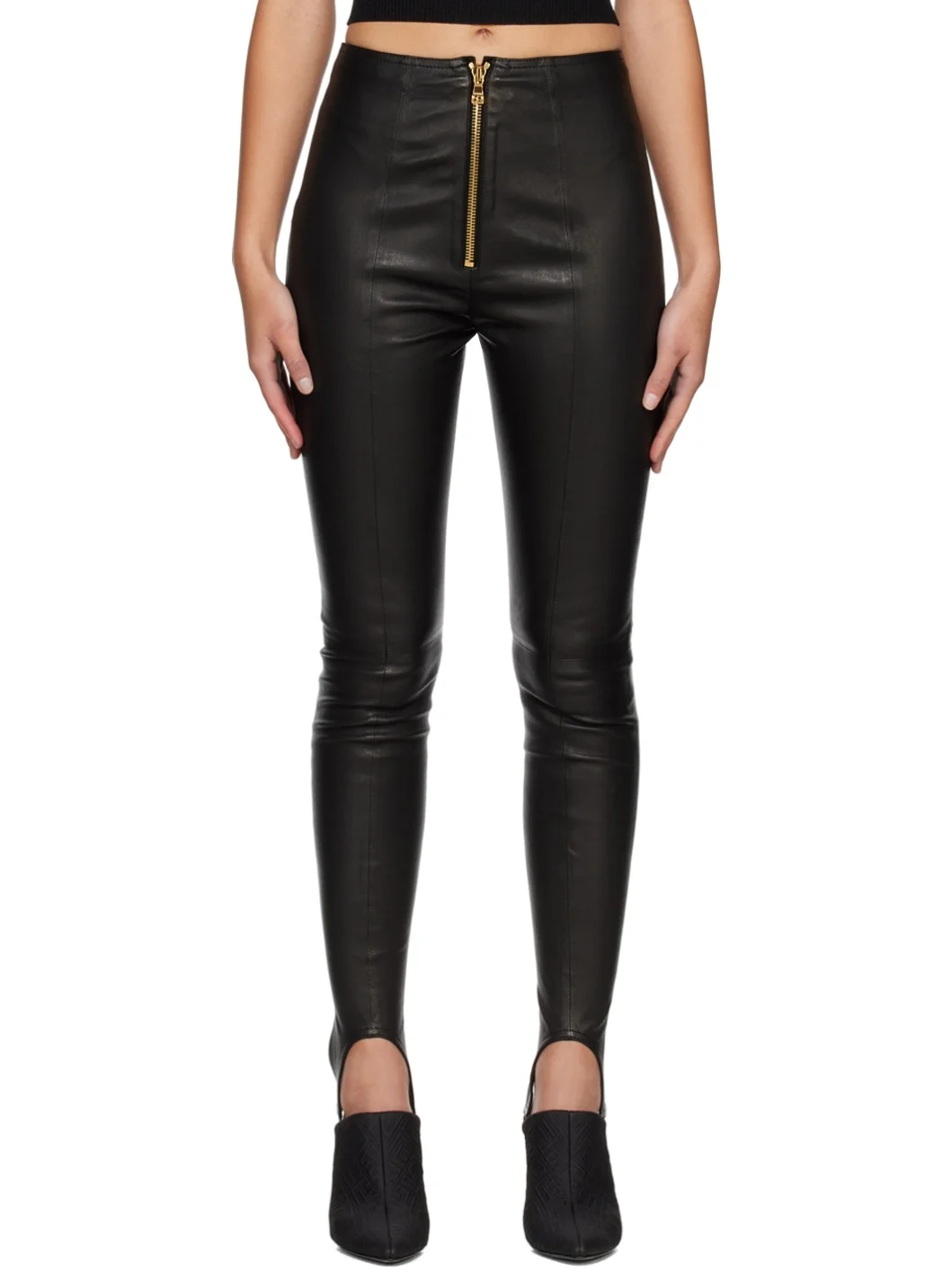 Grained lambskin leggings. · Elasticized stirrups at cuffs · Exposed zip-fly · Gold-tone hardware Supplier color: Black Body: 100% lambskin. Trim: 100% viscose. Made in Turkey 231251F085019