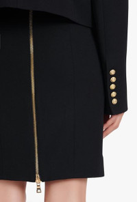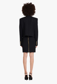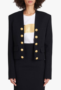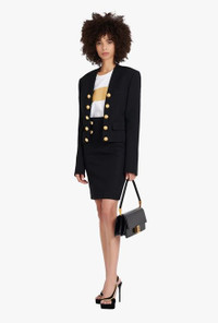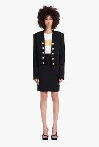 Black wool spencer jacket Long sleeves, structured shoulders, decorative double-breasted buttoned fastening, front flap pockets ITEM INFORMATION - Fitted cut - Fits true to size, select your usual size - The model is wearing FR size 36 - The model's height is 180 cm / 5 ft 11 in, bust 80 cm / 31 in, waist 59 cm / 23 in, hips 89 cm / 35 in - Made in Slovakia - Materials: 100% Wool - Item: XF0SC009WB050PA