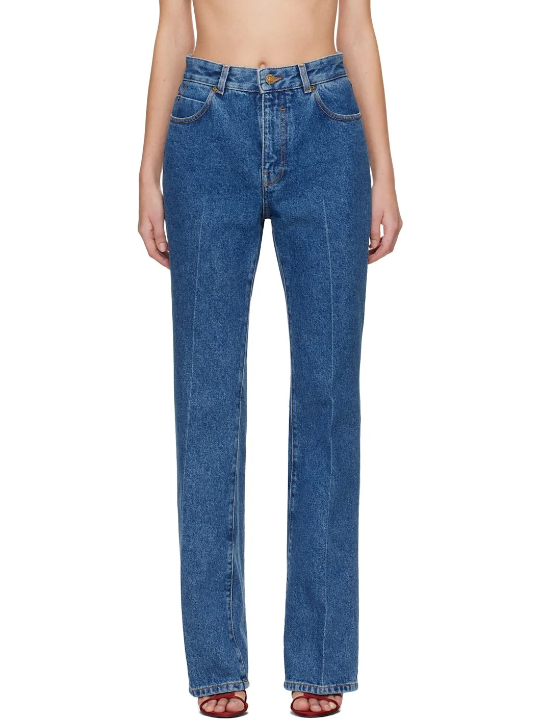 Non-stretch denim jeans. · Fading throughout · Boot cut · Belt loops · Five-pocket styling · Zip fly · Creased legs · Logo patch at back waistband · Contrast stitching in tan Supplier color: Blue Body: 100% cotton. Trim: 65% polyester, 35% cotton. Made in Romania 261251F069000