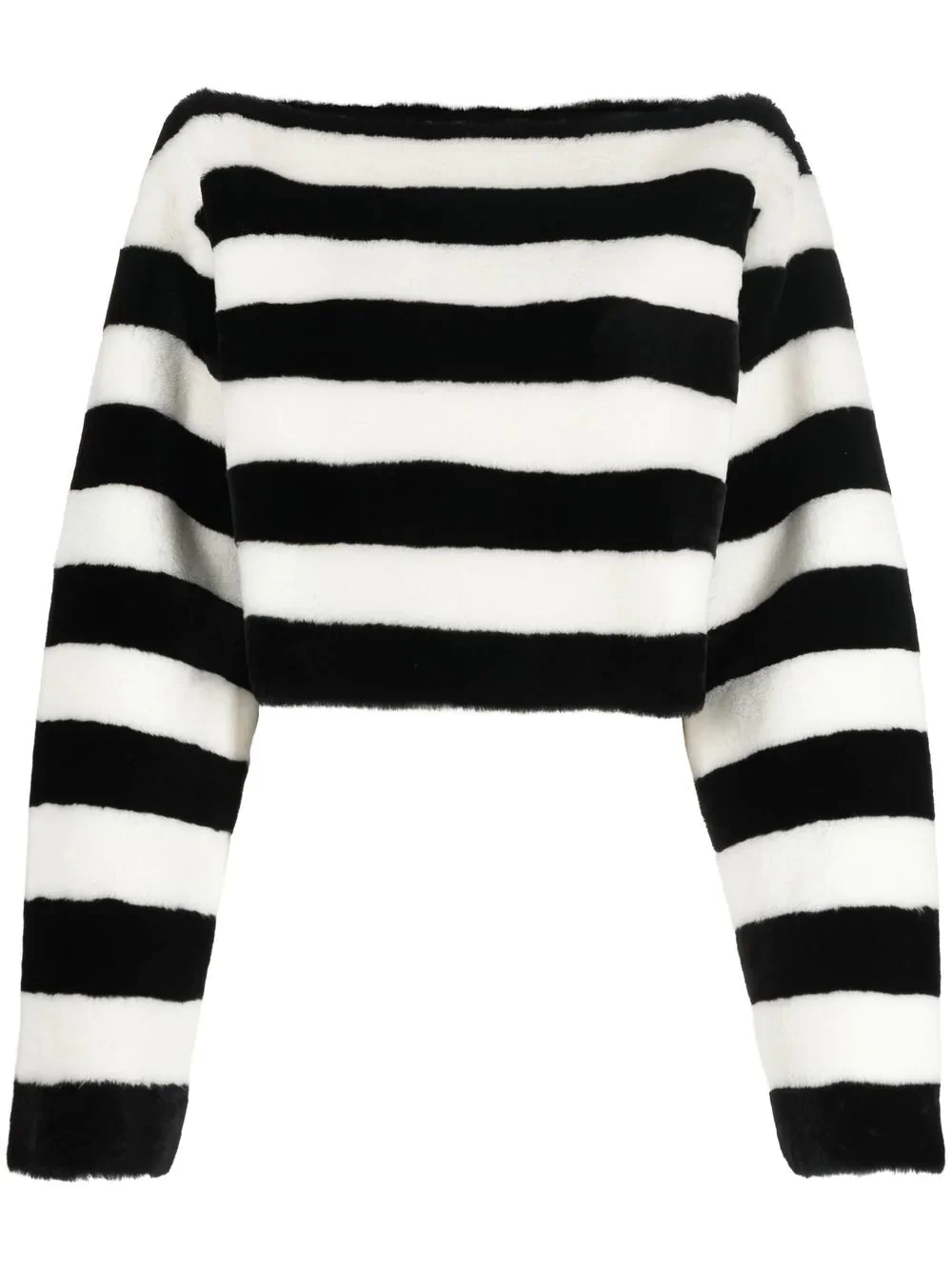 boat-neck striped jumper boat-neck striped jumper from Balmain featuring black/white, horizontal stripe print, boat neck, long sleeves and lamb fur. Made in Italy Composition Outer: Lamb Fur 100% Lining: Lambskin 100% SIZE & FIT Model measurements Height 5 ft 10 in(1.78 m) Bust/Chest 30.31 in(77 cm) Hips 36.61 in(93 cm) Waist 24.8 in(63 cm)