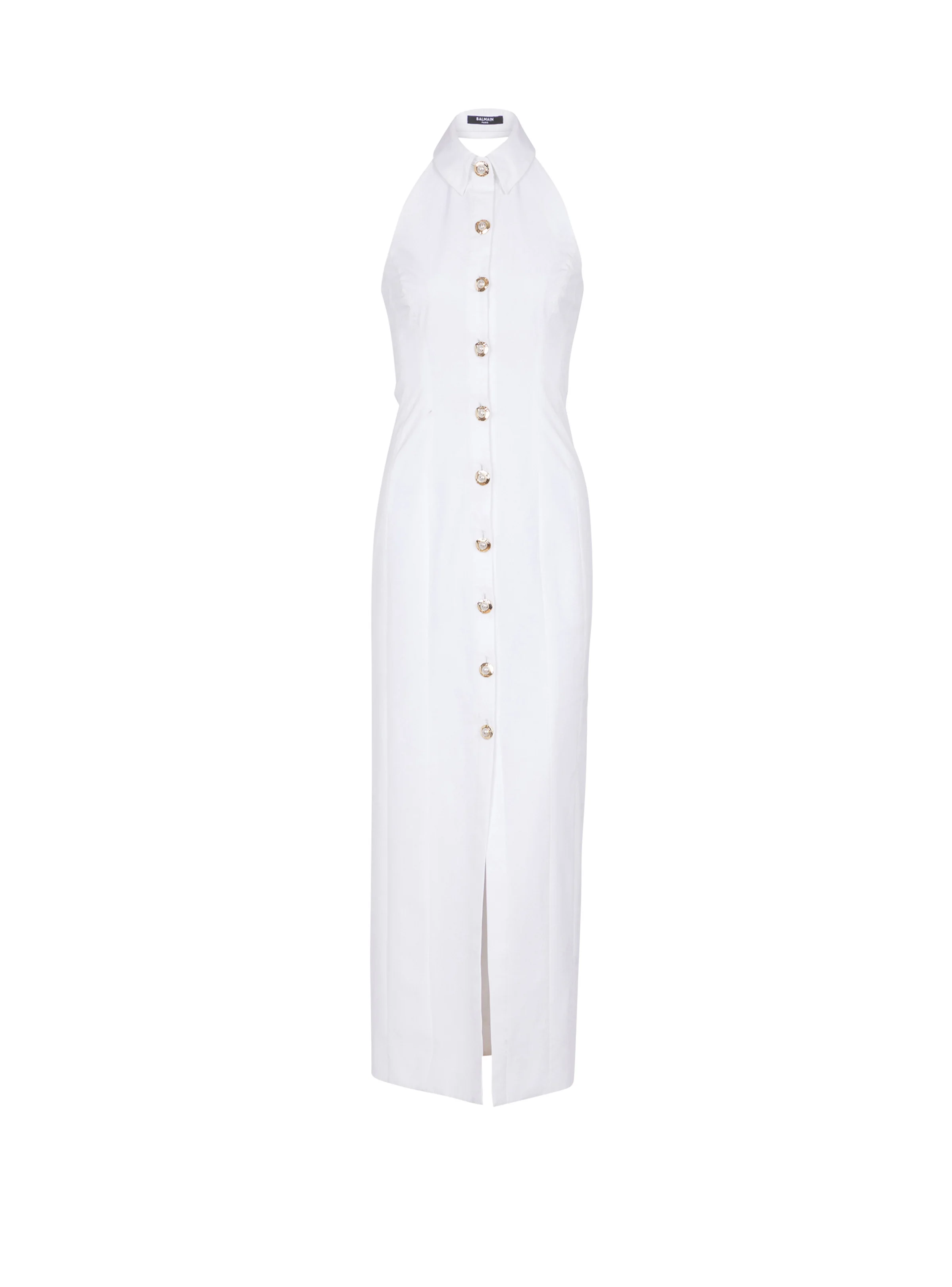 Bodycon backless block colour cotton poplin dress - Shirt collar - Sleeveless - Front fastening with 10 metal “Gold and Silver Coin” buttons - Front split - Cotton lining - Long, slim fit - Model measures 178cm and wears a size 36 - Main material: 100% cotton - Made in Italy - Item: FF1RP735CB09
