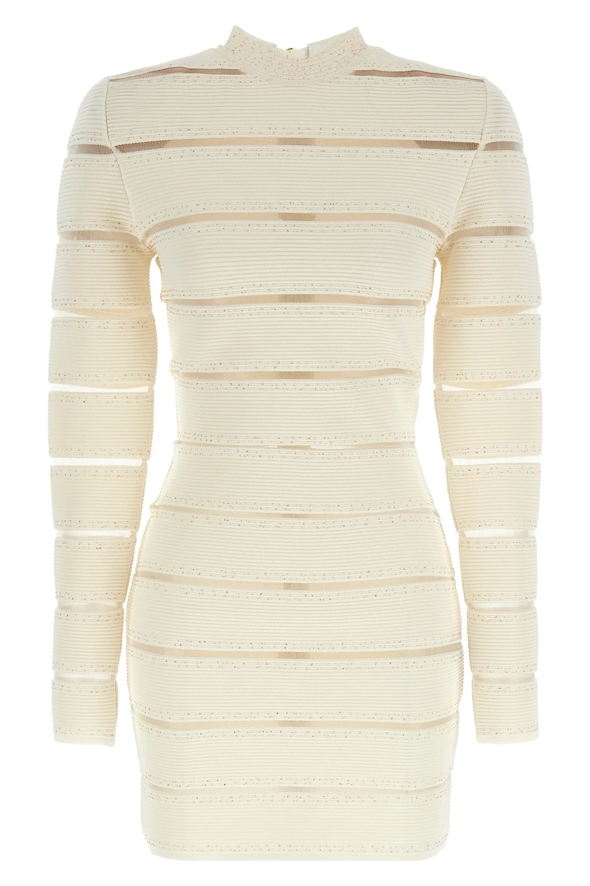 cod. GF0R8955KJ84GDK Bodycon mini dress in stretch viscose with transparent mesh inserts and micro sequin applique, crew neck, padded shoulders, long sleeves, and full-height zip closure at the back. Color: White Size & Fit: slim fit - FRENCH size Composition: 82% viscose 16% polyamide 2% elastane Made in: France