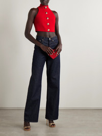 Balmain's top is made from wool-blend boucle in a vibrant red shade. It's designed in a cropped shape with a high neckline and row of hammered gold-tone buttons through the front - a closer look reveals the signature logo and crest featured within each.