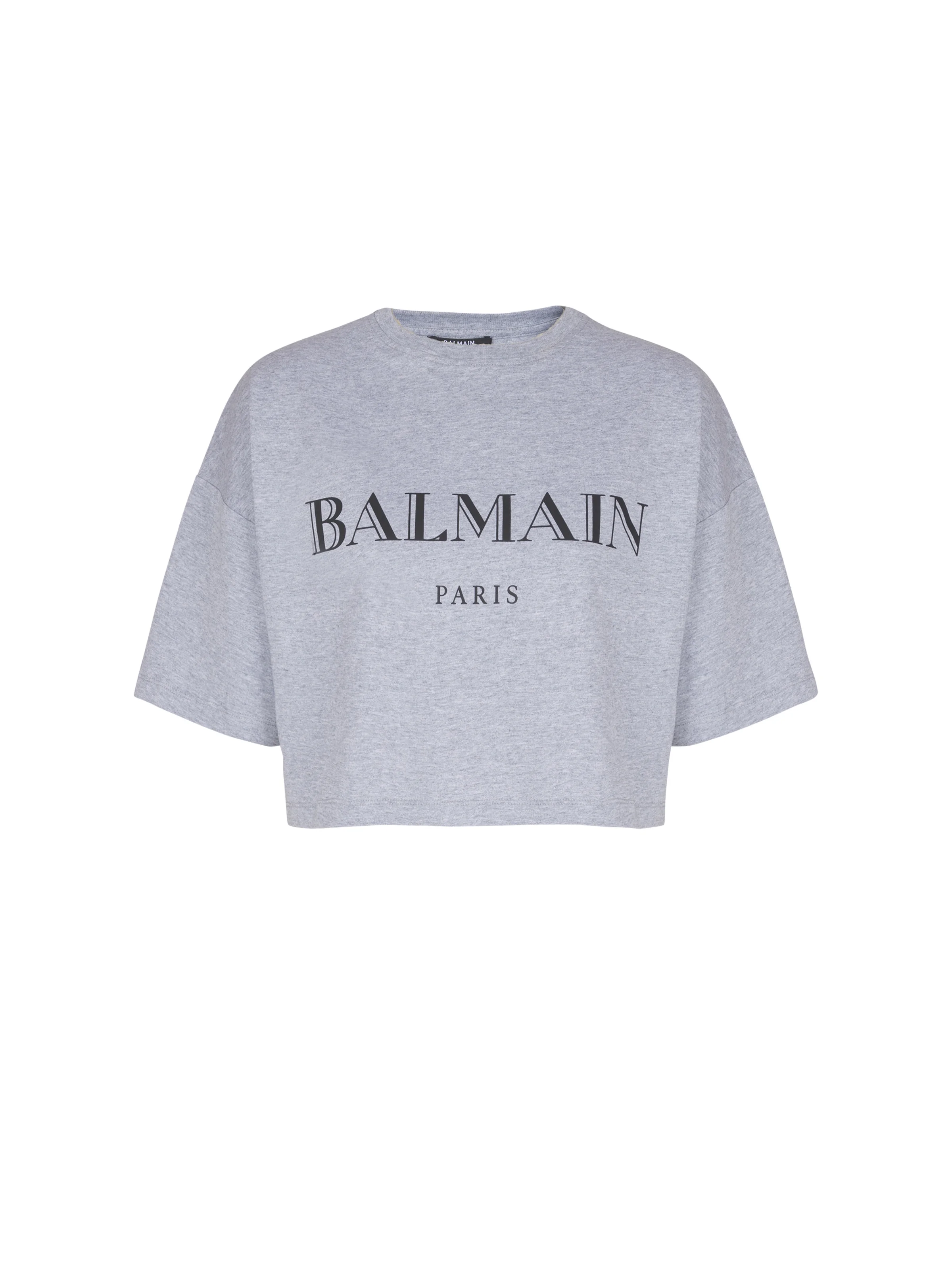 Boxy cropped T-shirt with Balmain print - Cropped, relaxed fit - Round neck with ribbed trim - Short sleeves - Vintage Balmain logo printed on the front - Model measures 178cm and wears a size S - Main material: 100% cotton - Made in Portugal - Item: FF2EE145BD33