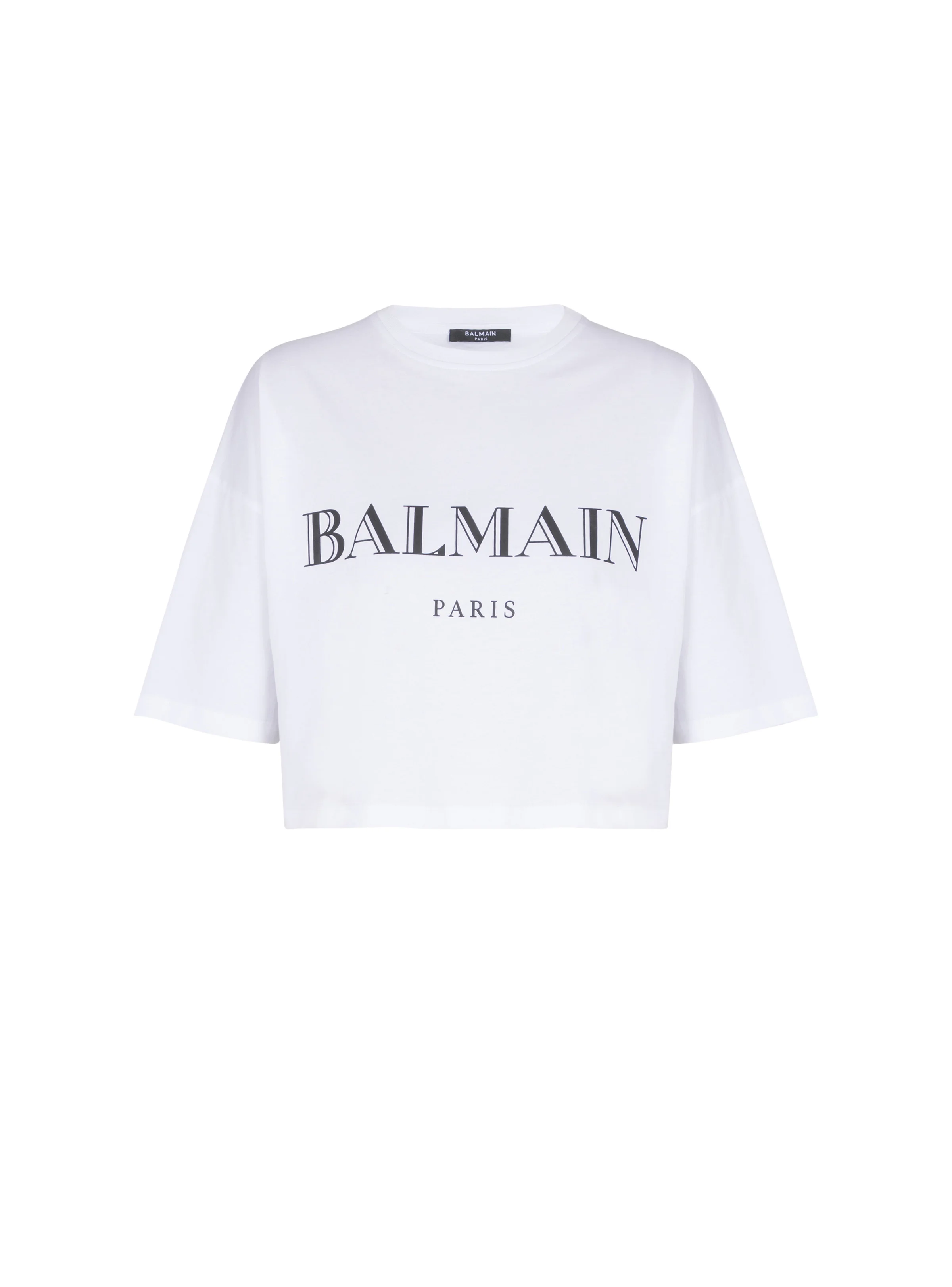 Boxy cropped T-shirt with Balmain print - Cropped, relaxed fit - Round neck with ribbed trim - Short sleeves - Vintage Balmain logo printed on the front - Model measures 178cm and wears a size S - Main material: 100% cotton - Made in Portugal - Item: FF2EE145BD28