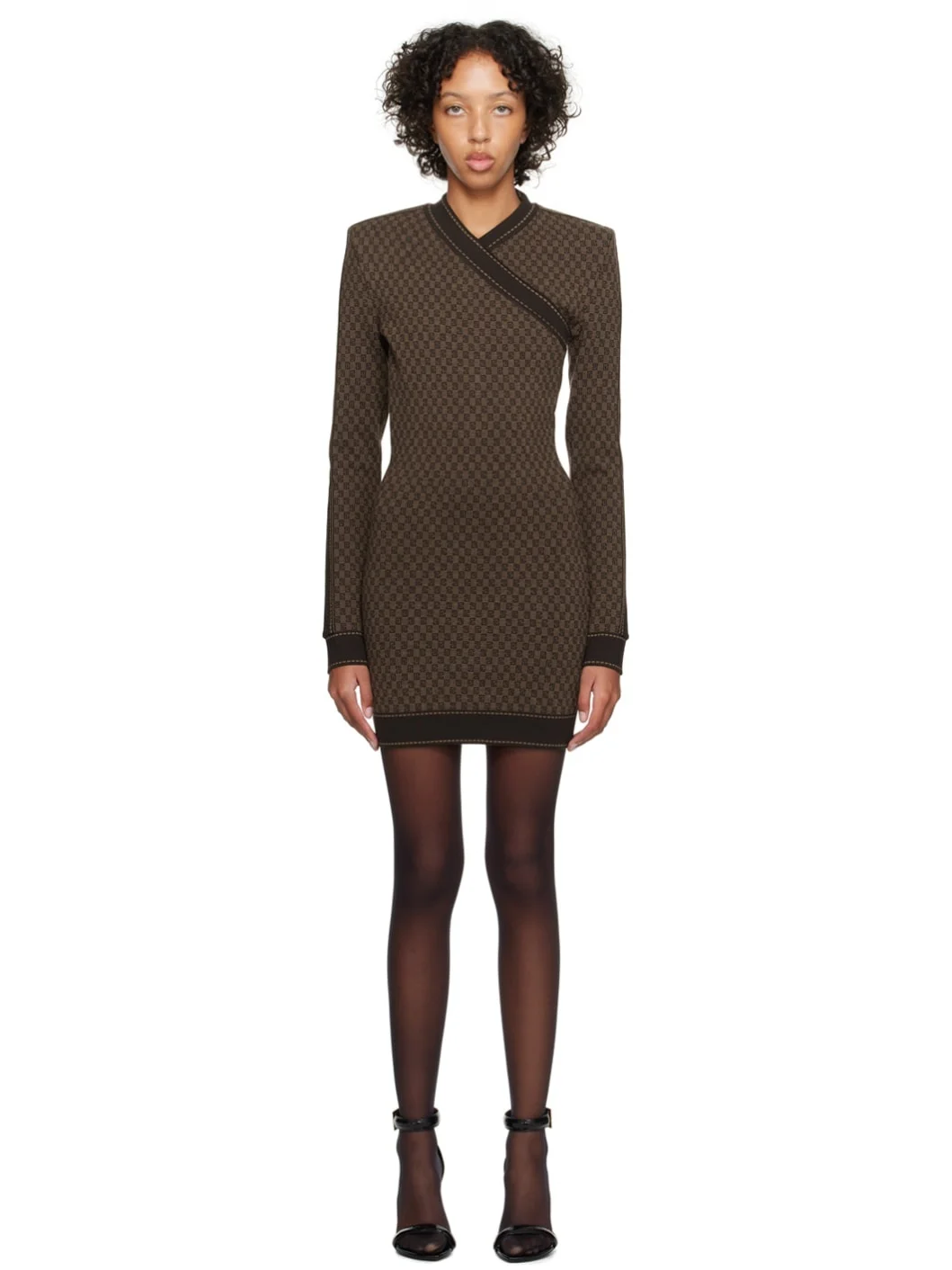 Knit merino wool- and nylon-blend dress. Jacquard logo pattern throughout. · Wrap construction · V-neck · Padded shoulders · Zip closure at back Supplier color: Marron/Marron Body: 80% merino wool, 20% nylon. Trim: 78% merino wool, 18% polyamide, 4% elastane. Made in France 241251F052000