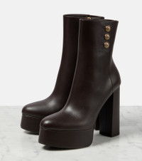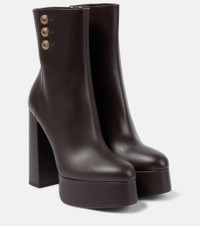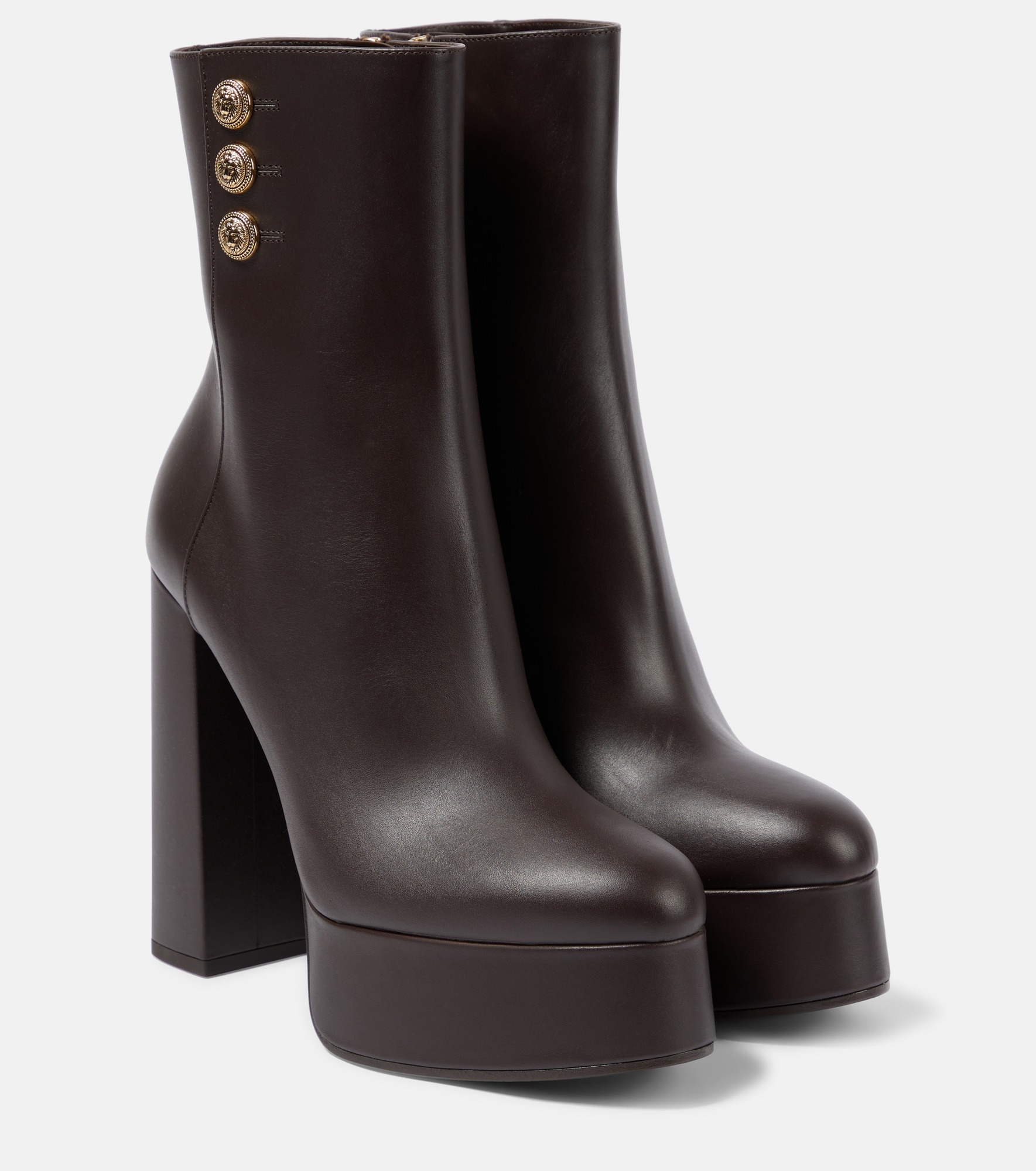 Made in Italy from smooth calf leather, the Brune platform ankle boots from Balmain have an almond-toe style. Adding a touch of elegance, three decorative metal lion head embellishments sit at the top of the leg shaft. Product Details - Upper: calf leather - Lining: leather - Sole: leather insole and sole - Toe shape: round toe - Made in Italy - Includes: shoe box, dust bag - Designer color name: Marron Fonce - Closure: zipped side - Item number: P00835205 Size & Fit - True to size - Slightly narrow - European sizes - 13,5cm-5.5" heel (size EU 38) - 4,5cm-2" platform (size EU 38)