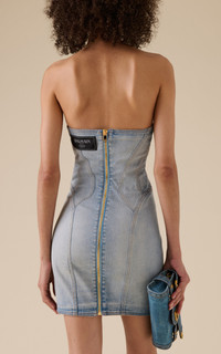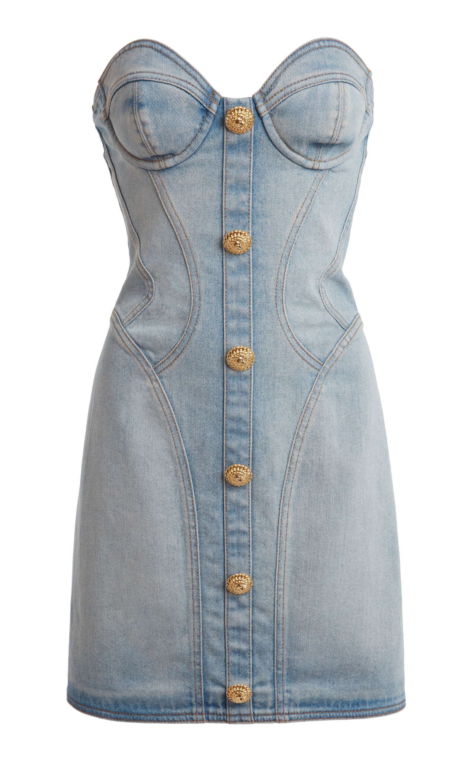 Balmain's Resort '25 extends last season's modern take on 'New French Style' with posh separates and classic silhouettes rendered in luxurious fabrication. Crafted from light blue denim, this mini dress is tailored with a darted shape and bustier neckline, finished with golden shank buttons. PRODUCT DETAILS - Resort '25 - Zip fastening along back - Composition: 85% Viscose, 15% Polyester - Dry clean only - Made in France SIZE & FIT - Designed for a slim fit