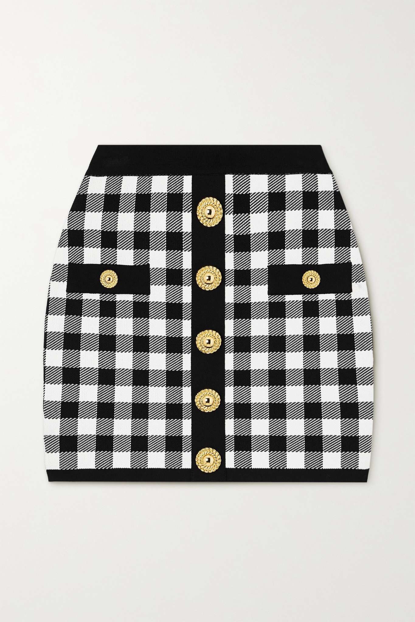 EDITORS'NOTES From the bold gingham pattern to the decorative gold-tone buttons, Balmain's mini skirt feels like a prized vintage find. It's jacquard-knitted for a close fit and designed to sit on the waist, so it'll look especially chic with the matching cropped top. SIZE & FIT - Fits true to size, take your normal size - Mini-length, designed to be worn at the waist - Lightweight knit - Model is 177cm/ 5'10" and is wearing a FR 36 DETAILS & CARE - Black and white jacquard-knit - Zip fastening along back - 90% viscose, 10% polyamide