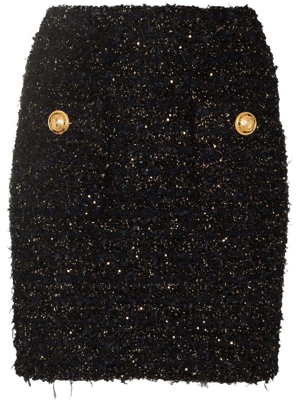 EDITORS'NOTES Balmain's mini skirt is cut from tactile bouclé-tweed that's lightly frayed around the edges. As is only right for the storied Parisian house, it's detailed with signature embossed gold buttons and a glossy tonal zip. SIZE & FIT - Fits true to size, take your normal size - Mini-length, designed to be worn at the waist - Mid-weight, slightly stretchy fabric - Model is 175cm/ 5'9" and is wearing a FR 36 DETAILS & CARE - Black and gold bouclé-tweed - Zip fastening along back - 44% polyamide, 37% viscose, 19% polyester
