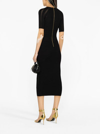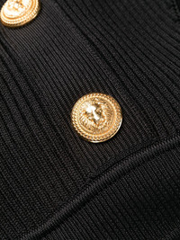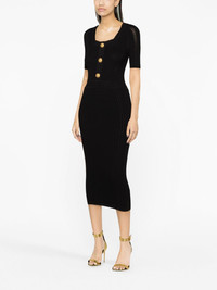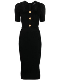 button-embellished ribbed-knit dress Balmain’s ribbed-knit dress is spun to a figure-hugging silhouette, keeping a trio of decorative gold-tone buttons in focus. Each one is intricately engraved with the iconic lion’s head. Highlights - Black - Ribbed knit - Decorative button detailing - Gold-tone hardware - Square neck - Rear zip fastening - Short sleeves - Mid-calf length - Straight hem Made in Italy Composition Viscose 83%, Polyamide 17% SIZE & FIT Model measurements Height 5 ft 10 in(1.77 m) Bust/Chest 32.67 in(83 cm) Hips 35.43 in(90 cm) Waist 23.62 in(60 cm) Measurement BUST 25.19 in(64 cm) LENGTH 48.81 in(124 cm) WAIST 24.4 in(62 cm) SLEEVE LENGTH 3.54 in(9 cm) HIPS 23.62 in(60 cm) Washing instructions Dry Clean Only