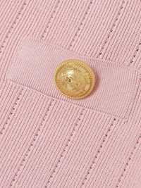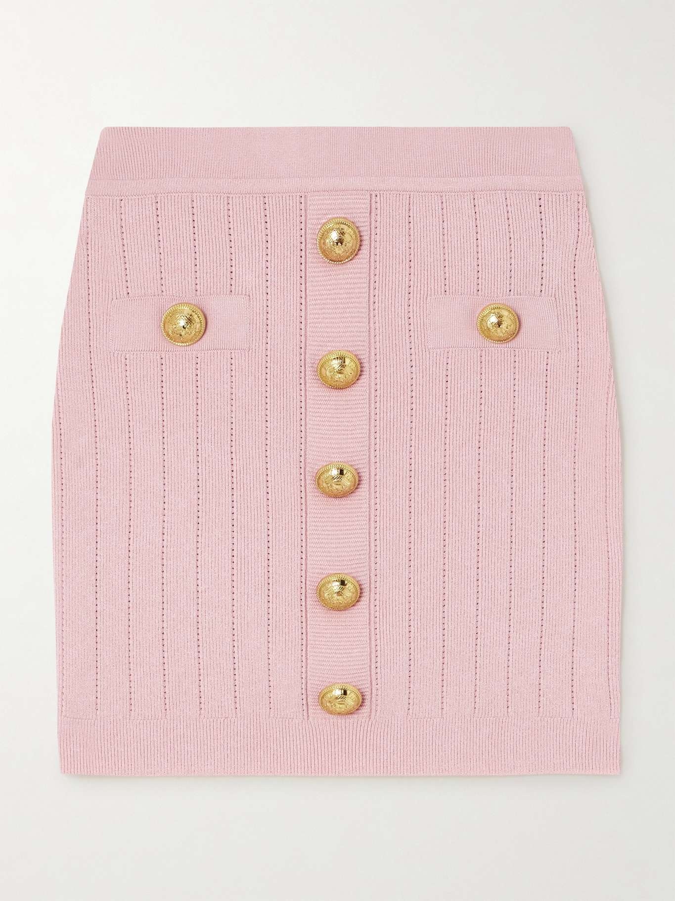 EDITORS'NOTES Balmain's mini skirt is part of a coordinating set with the matching cardigan in our edit - they look sophisticated when styled together. It's made from baby-pink ribbed-knit for a figure-hugging fit and has gold-tone buttons intricately engraved with the crest. SIZE & FIT Model measurements: - Fits true to size, take your normal size - Mini-length, designed to be worn at the waist - Lightweight knit - Model is 175cm/ 5'9" and is wearing a FR 36 - Bust: 78cm/ 31" - Waist: 62cm/ 24.5" - Hip: 92cm/ 36" DETAILS & CARE - Pink viscose-blend - Zip fastening along back - 83% viscose, 17% polyester - Dry clean