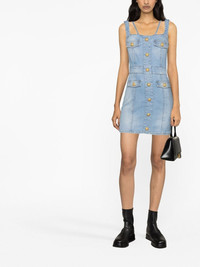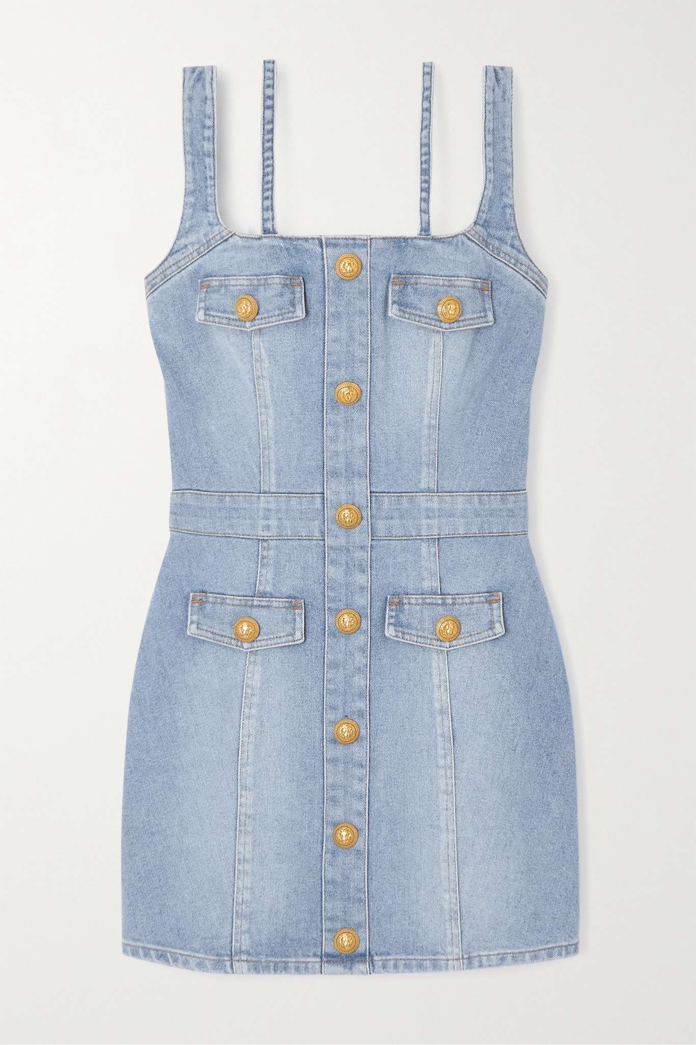 EDITORS'NOTES Balmain's mini dress is cut from light-blue stretch-denim that's complemented by the gold buttons and zipper - match your jewelry to the hardware. It has four pockets to tap into the utility feel and dainty straps that will frame a necklace. Wear it with your favorite knee boots or sandals. SIZE & FIT - Fits true to size, take your normal size - Designed for a slim fit - Mid-weight, stretchy fabric - Model is 177cm/ 5'10" and is wearing a FR 36 DETAILS & CARE - Light-blue stretch-denim - Zip fastening along back - 98% polyester, 2% elastane; trim: 65% polyester, 35% cotton - Dry clean