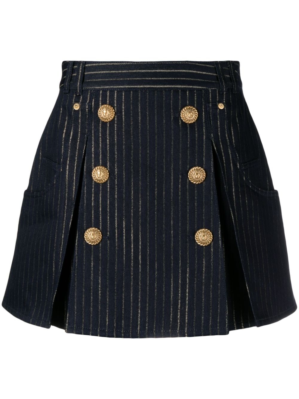 button-embellished striped miniskirt Eye-catching embossed buttons are a mainstay at Balmain, speaking to the house's opulent aesthetic. They appear in a gold-tone finish here, complementing the piece's metallic striped pattern for an elevated casual look. Highlights - Midnight blue - Cotton blend - Metallic threading - High waist - Belt loops - Embossed gold-tone buttons - Rear zip fastening - A-line - Thigh-length - Straight hem Composition Outer: Cotton 69%, Viscose 20%, Metallized Polyester 11% Lining: Polyester 65%, Cotton 35% SIZE & FIT Model measurements Height 5 ft 10 in(1.77 m) Bust/Chest 30.3 in(77 cm) Hips 34.6 in(88 cm) Waist 24 in(61 cm) FittingInformation This mini-length skirt is intended to be worn just below the waist Made from a midweight non-stretch fabric This piece fits small – take one size up