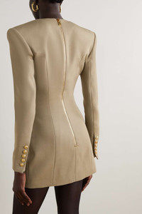 EDITORS'NOTES Olivier Rousteing is proud of Balmain's timelessness and trailblazer status, which is why the designer remains so faithful to the iconic house codes. Tailored from wool, this blazer-style mini dress is defined by its structured shoulders and is finished with a signature gold button. SIZE & FIT - Fits true to size, take your normal size - Designed for a slim fit - Mid-weight, non-stretchy fabric - Model is 177cm/ 5'10" and is wearing a FR 36 DETAILS & CARE - Beige wool - Zip fastening along back - 100% wool; lining: 52% viscose, 48% cotton - Hand wash