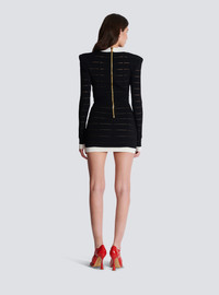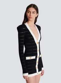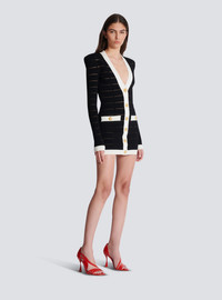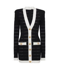 Two-tone knit dress with buttons - Short fitted cut - Plunging V-neck - Structured shoulders - Long sleeves - 6 decorative buttons on the front - 2 fake pockets with 2 decorative buttons - "Double Chain Lion" buttons in gold metal - Visible gold metal zip fastening on the back with Balmain Paris-engraved slider - Knit with sheer narrow stripes - Contrasting ribbed edging - Model measures 180cm and wears a size 36 - Main material: 87% viscose 12% polyester 1% polyamide - Made in Italy - Item: DF1R8053KG59100% of the viscose fibres used to make this garment come from certified, sustainably managed forests