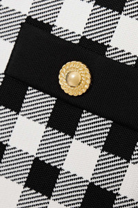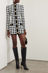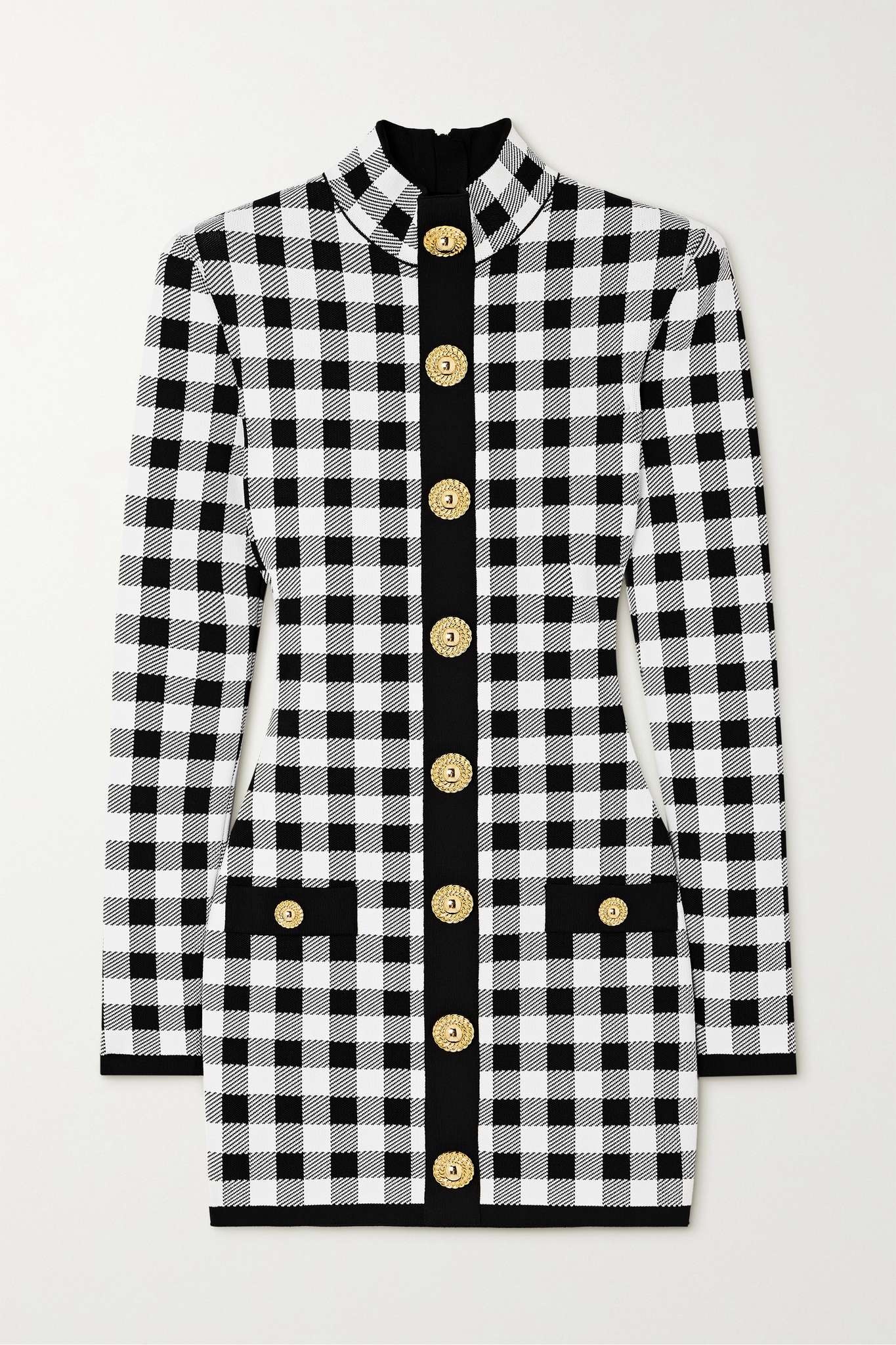 EDITORS'NOTES Balmain's bold and glamorous mini dress will ensure all eyes are on you. Jacquard-knitted with gingham checks, the figure-hugging design has sharply padded shoulders and a high neckline spliced with decorative gold-tone buttons. Contrast the monochromatic palette with red pumps. SIZE & FIT - Fits true to size, take your normal size - Designed for a close fit - Mid-weight knit - Model is 177cm/ 5'10" and is wearing a FR 36 DETAILS & CARE - Black and white jacquard-knit - Zip fastening along back - 90% viscose, 10% polyamide