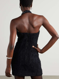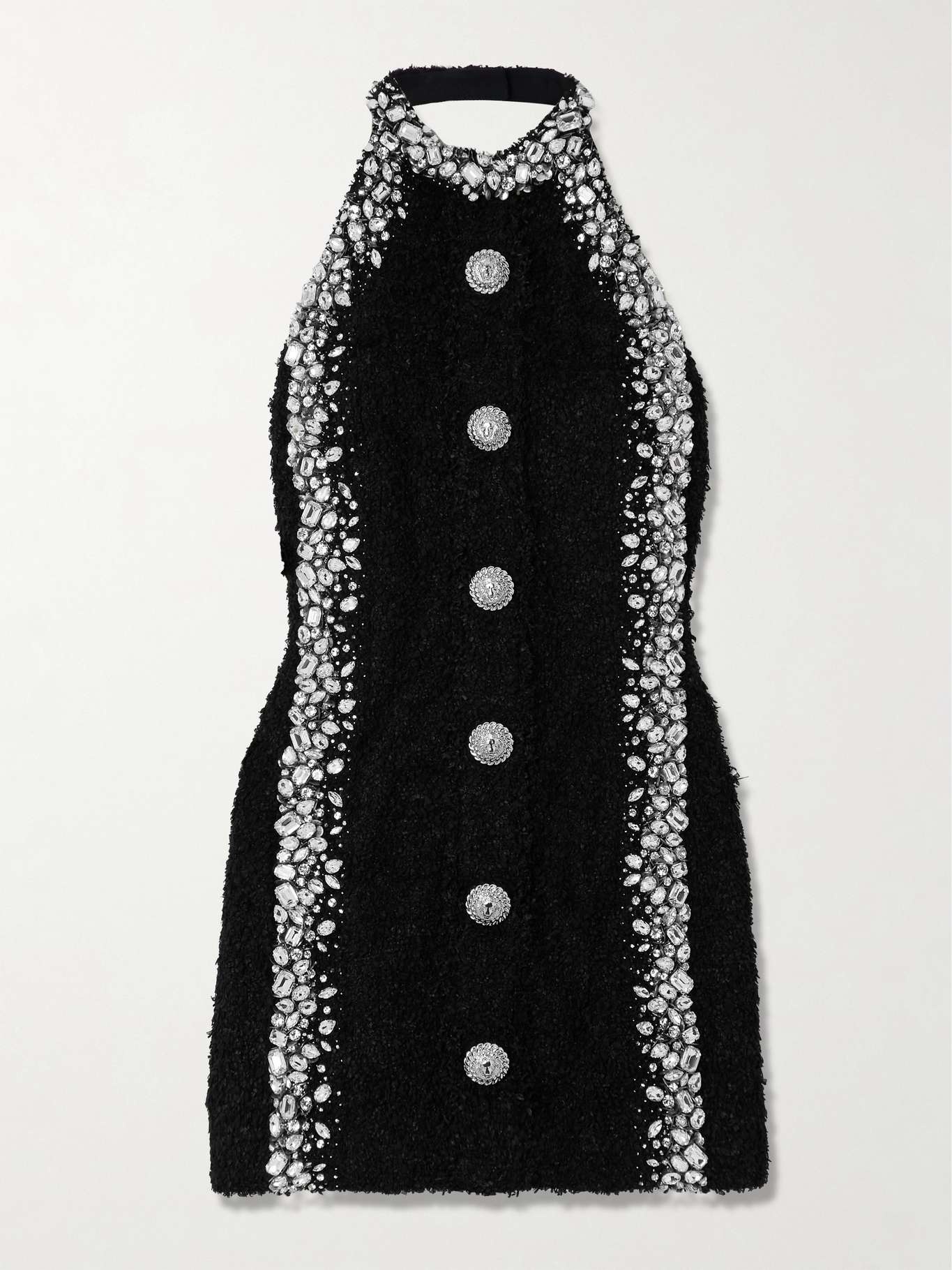 EDITORS'NOTES Balmain's penchant for dramatic silhouettes results in captivating designs that look like works of art. This mini dress is cut from tactile boucle with a halter neckline, outlined with icy crystals and adorned with silver-tone lion-embossed buttons along the front. Small to size. See Size & Fit notes SIZE & FIT Model measurements: - Fits small to size, take one size larger than normal - Designed for a slim fit - Mid-weight knit - Model is 177cm/ 5'10", normally wears a FR 36 and is wearing a FR 38 - Bust: 79cm/ 31" - Waist: 61cm/ 24" - Hip: 89cm/ 35" DETAILS & CARE - Black boucle - Hooks at neck, zip fastening along back - 100% polyamide - Dry clean