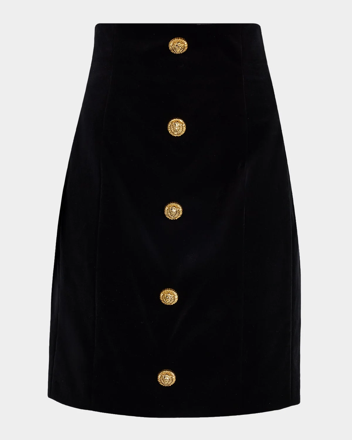 Balmain skirt is crafted from soft velvet adorned with goldtone lion buttons High waist Midthigh length Pencil silhouette Back zip Cotton Made in France