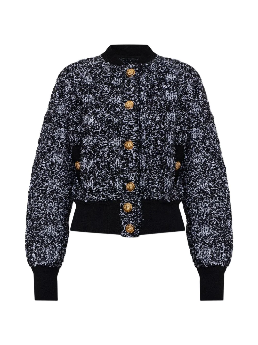 button tweed jacket Highlights - Black and white - Tweed effect - Round neck - Front button fastening - Long sleeves - Ribbed hem Made in France Composition Polyamide 60%, Cotton 18%, Viscose 16%, Polyester 3%, Metal 3% Washing instructions Read Manufacturer Guidelines