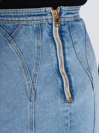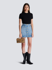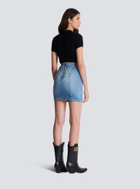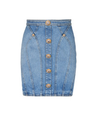 Buttoned denim skirt - Short, tight, high-waisted fit - 7 decorative buttons on the front (2 small) - Two-tone "Double Chain Lion" buttons in gold and silver metal - Visible gold metal zip fastening on the back with Balmain Paris-engraved slider - Light blue wash - Model measures 180cm and wears a size 36 - Main material: 98% cotton 2% elastane - Made in Albania - Item: DF1LBA22DE53