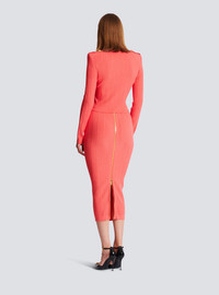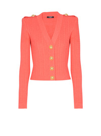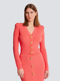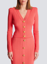Ribbed and cable-knit cardigan - V-neckline - Shoulder tabs with decorative buttons - Structured shoulders - Long sleeves - Front fastening with 4 press studs - “Coin” golden metal button - Ribbed trim - Fitted cut - Model measures 179cm and wears a size 36 - Main material: 83% viscose 17% polyester - Made in France - Item: FF1KL245KI50100% of the viscose fibres used to make this garment come from certified, sustainably managed forests