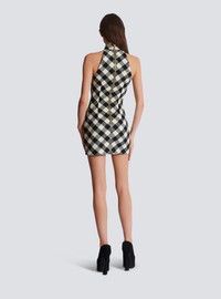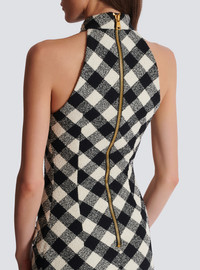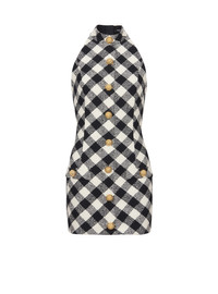 Short tweed dress with buttons - Short fitted cut - Halter neckline - Sleeveless - 8 decorative buttons on the front - "Snail" buttons in gold metal - Visible metal zip fastening on the back with Balmain-engraved slider - Model measures 175cm and wears a size 36 - Main material: 62% cotton 34% polyester 4% other fibres - Made in Bulgaria - Item: DF0R3255CF57