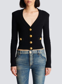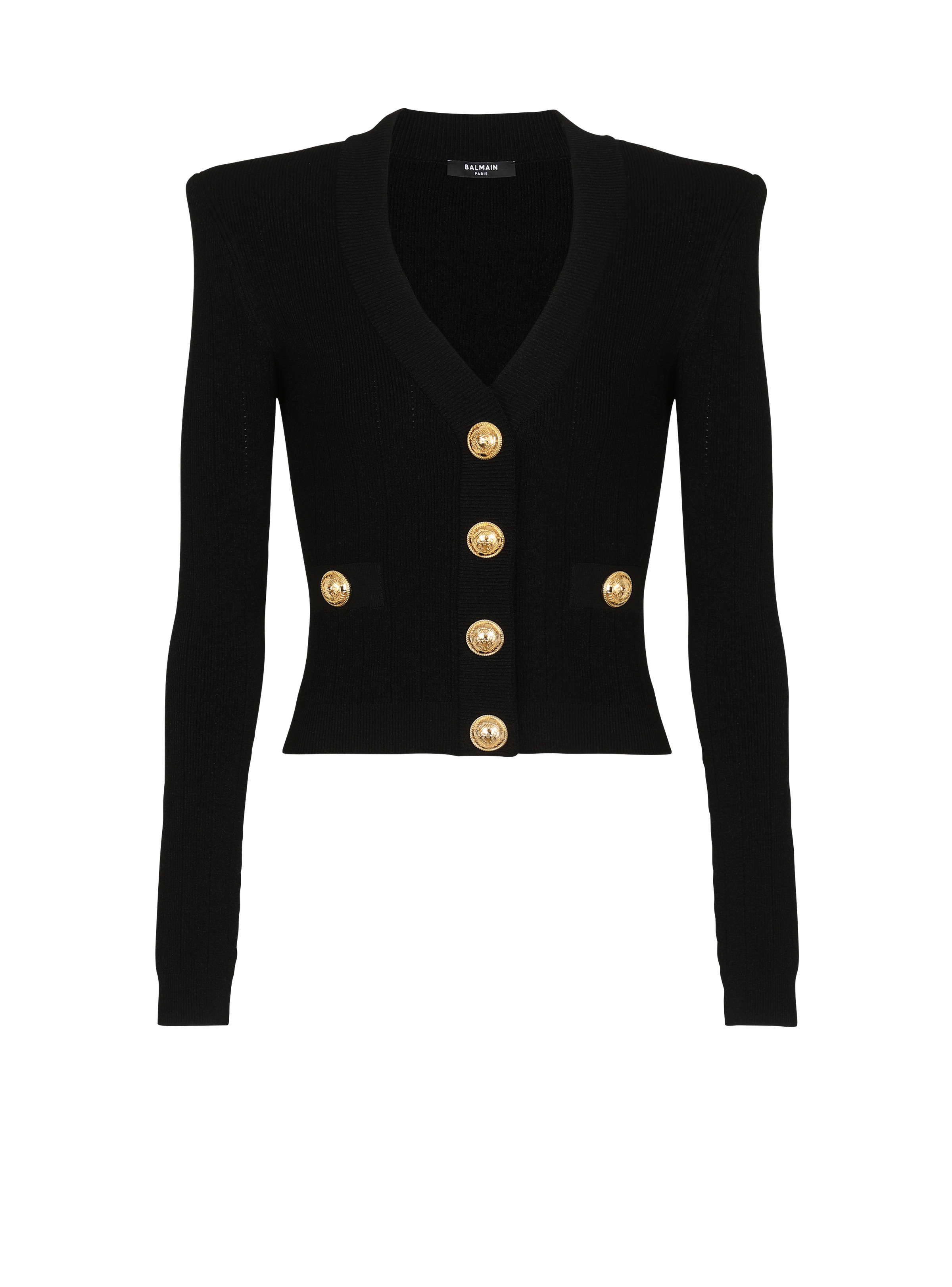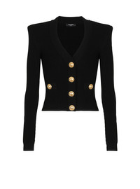 Fine ribbed knit buttoned cardigan - Tight fit - V-neck - Structured shoulders, long sleeves - Fastening with 4 “Signature Coin” golden metal buttons on the front - 2 trompe-l'œil pockets - Model measures 180cm and wears a size 36 - Main material: 83% viscose 17% polyester - Made in France - Item: CF1KL007KB07100% of the viscose fibres used to make this garment come from responsibly managed and FSC®-certified forests
